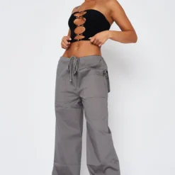 The All Me Tie Back Top in Charcoal is a basic with a stylish twist. Featuring a cropped length, cowl plunge neckline, open back with tie and thick stretch fabric. Style with cargo pants and heels.