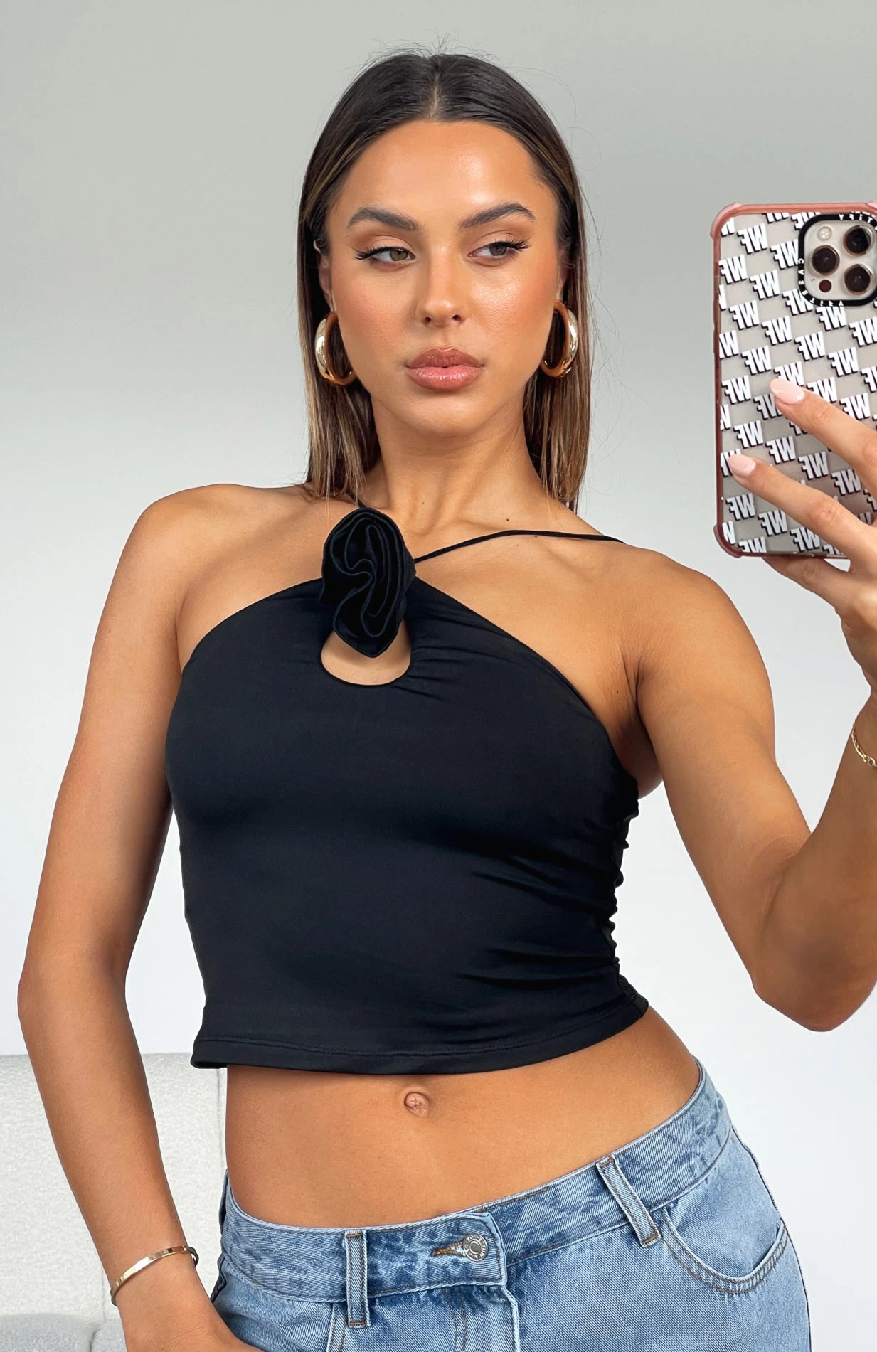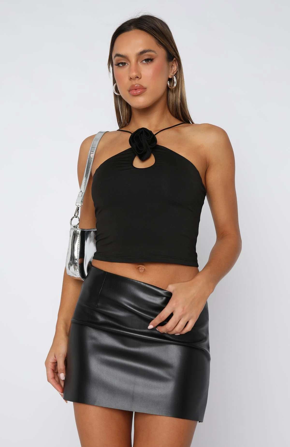 Wear your roses with the Big Decisions Rosette Top Black. Features thin straps, halter neck style, front cut-out design, rosette detail centre front, cropped length and soft, stretch fabric. Pair with a PU mini skirt and shoulder bag for an on trend look worthy of your next instagram post!