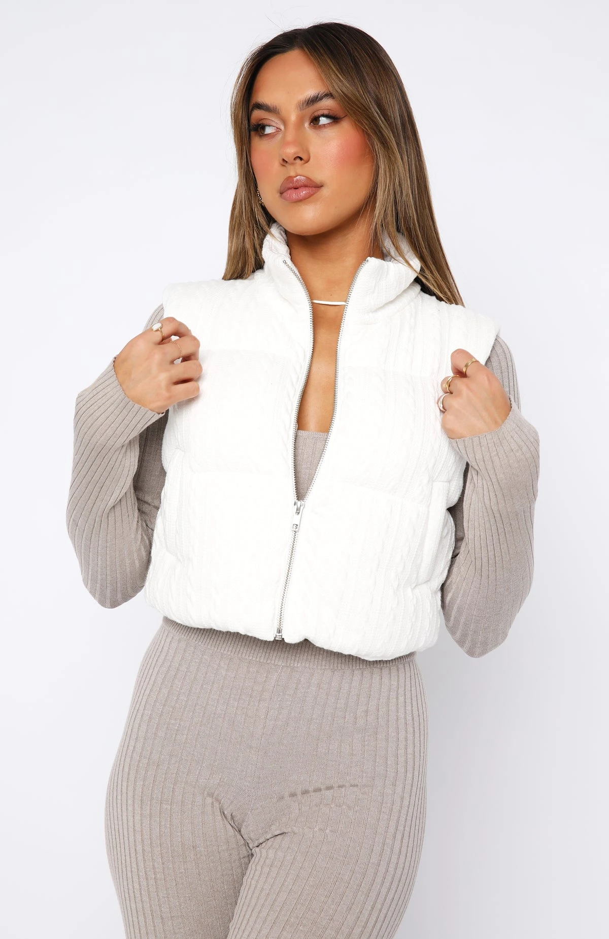 Bundle up in the Chalet Girl Puffer Vest Off White. Features functional zip closure, quilted body and stand collar. Complete the look with your favourite pair of White Fox Denim Jeans, long sleeve top and sneakers for the perfect winter outfit.