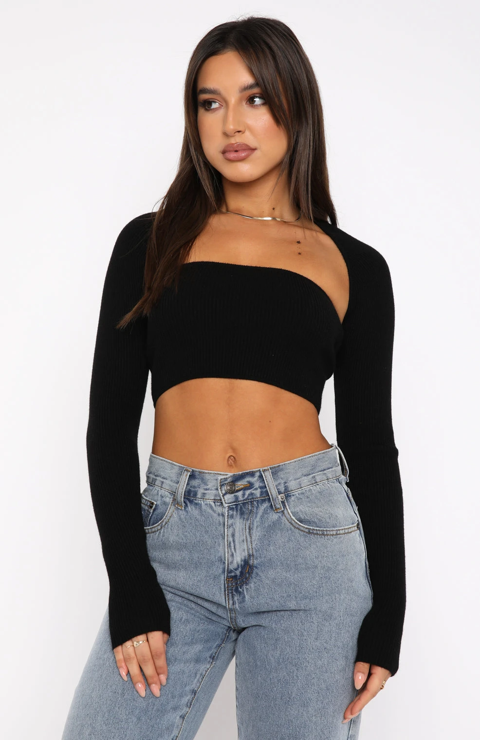 Channel everyday street style in the Forgetting You Ribbed Knit Long Sleeve Crop in Black. Featuring detachable long sleeve top, strapless top and ribbed stretch fabric. Pair with cargo pants and sneakers for a cool girl fit.