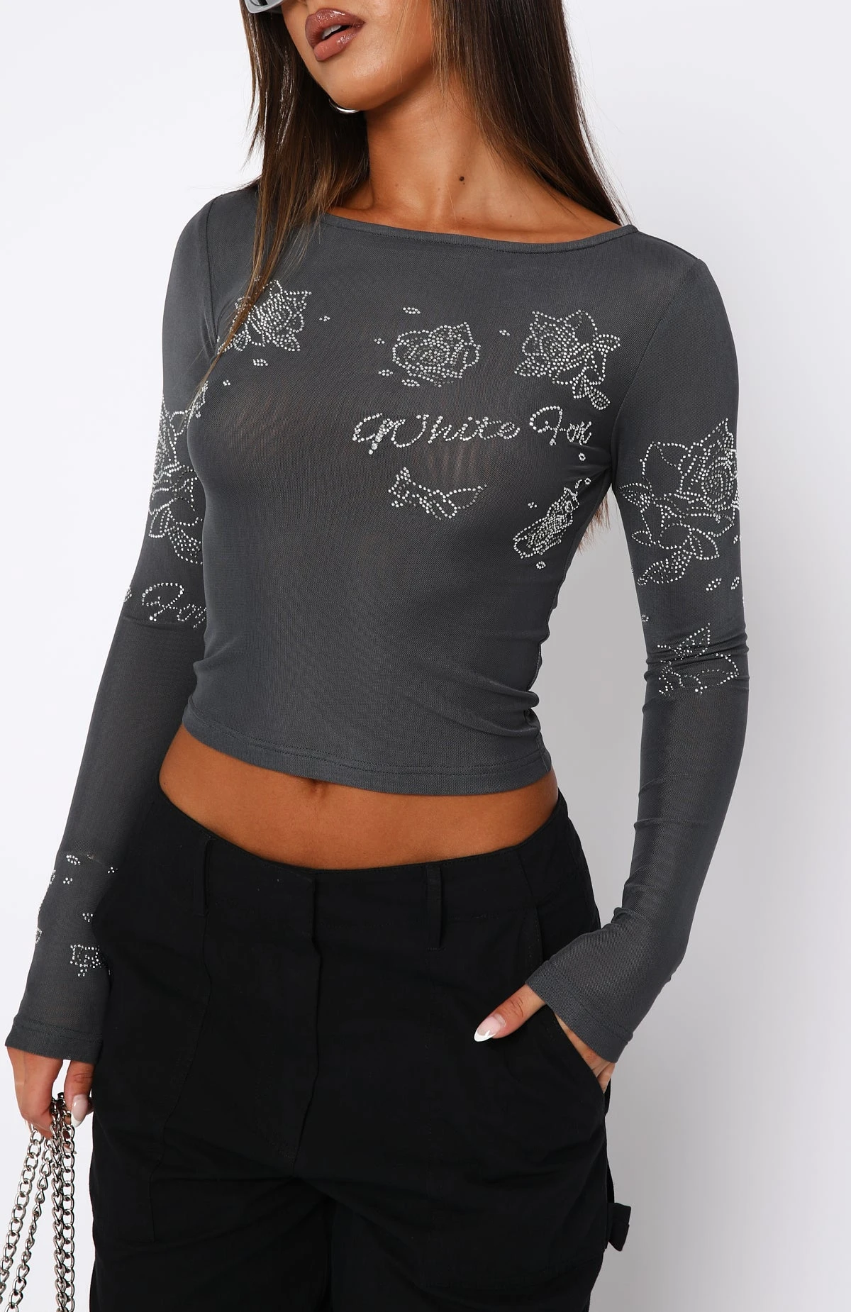 The Headstrong Long Sleeve Top in Charcoal is sure to nail major trends this season. Featuring long sleeves, high neckline, diamanté embellished logo and lined, mesh fabric. Complete the look with your favourite pair of White Fox Denim Jeans and perspex heels for a look we are obsessed with!