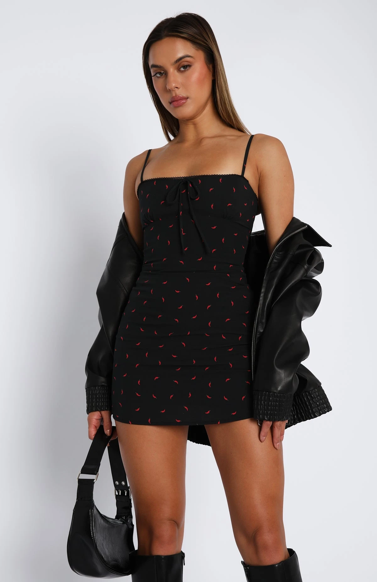 You’ll be looking spicy in the Lose Control Mini Dress in Black Chilli Print. Featuring thin, adjustable straps, straight neckline, front tie-design, invisible zipper centre back and lined fabric. Complete the look with gold accessories and knee-high boots for a look that will turn heads!