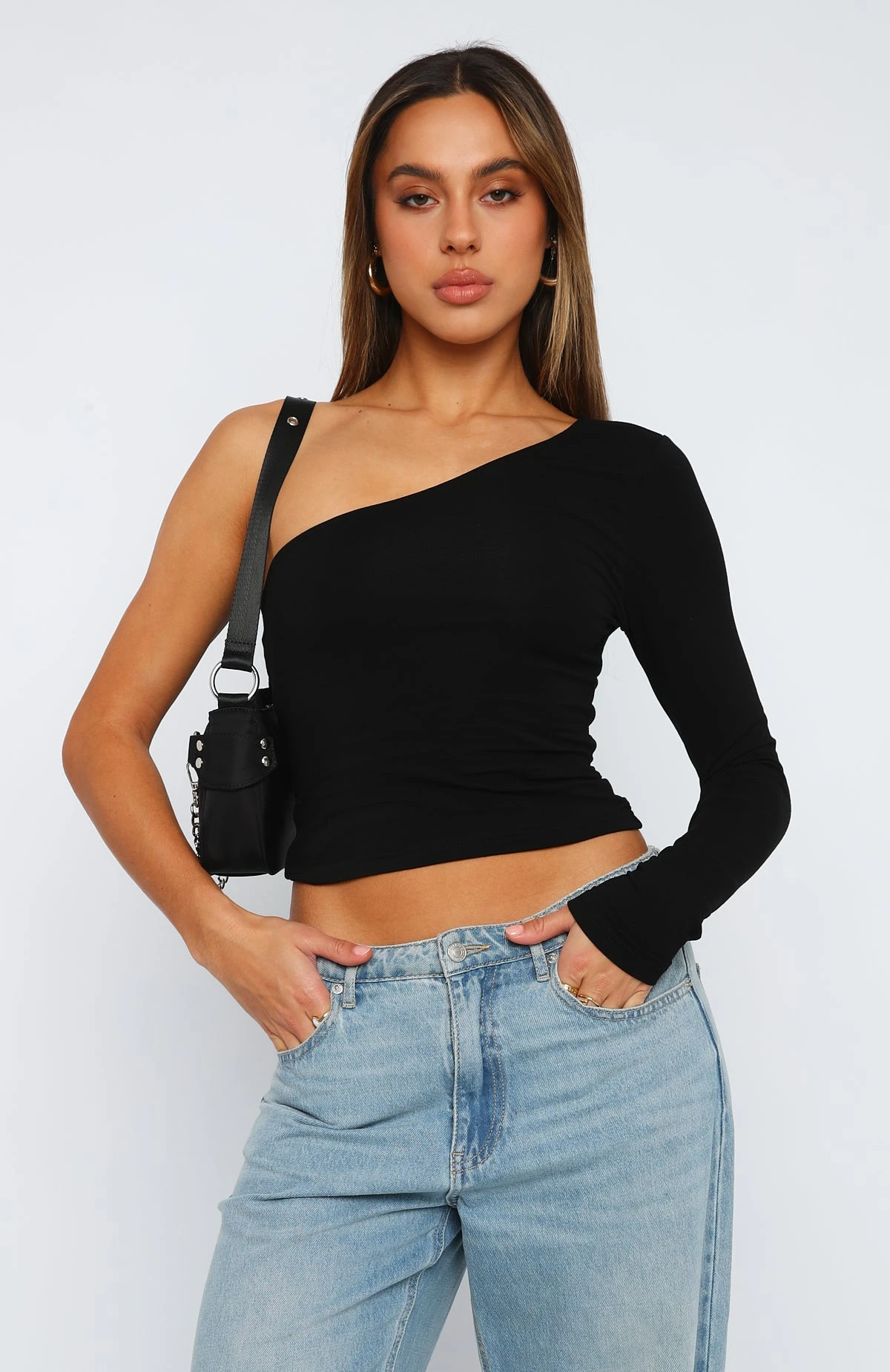 Don’t wait for cooler weather with the Midnight Talks One Shoulder Top Black. Featuring a long sleeve, an off-the-shoulder design and soft stretch fabric. Pair with cargo pants and gold accessories for a dreamy look!