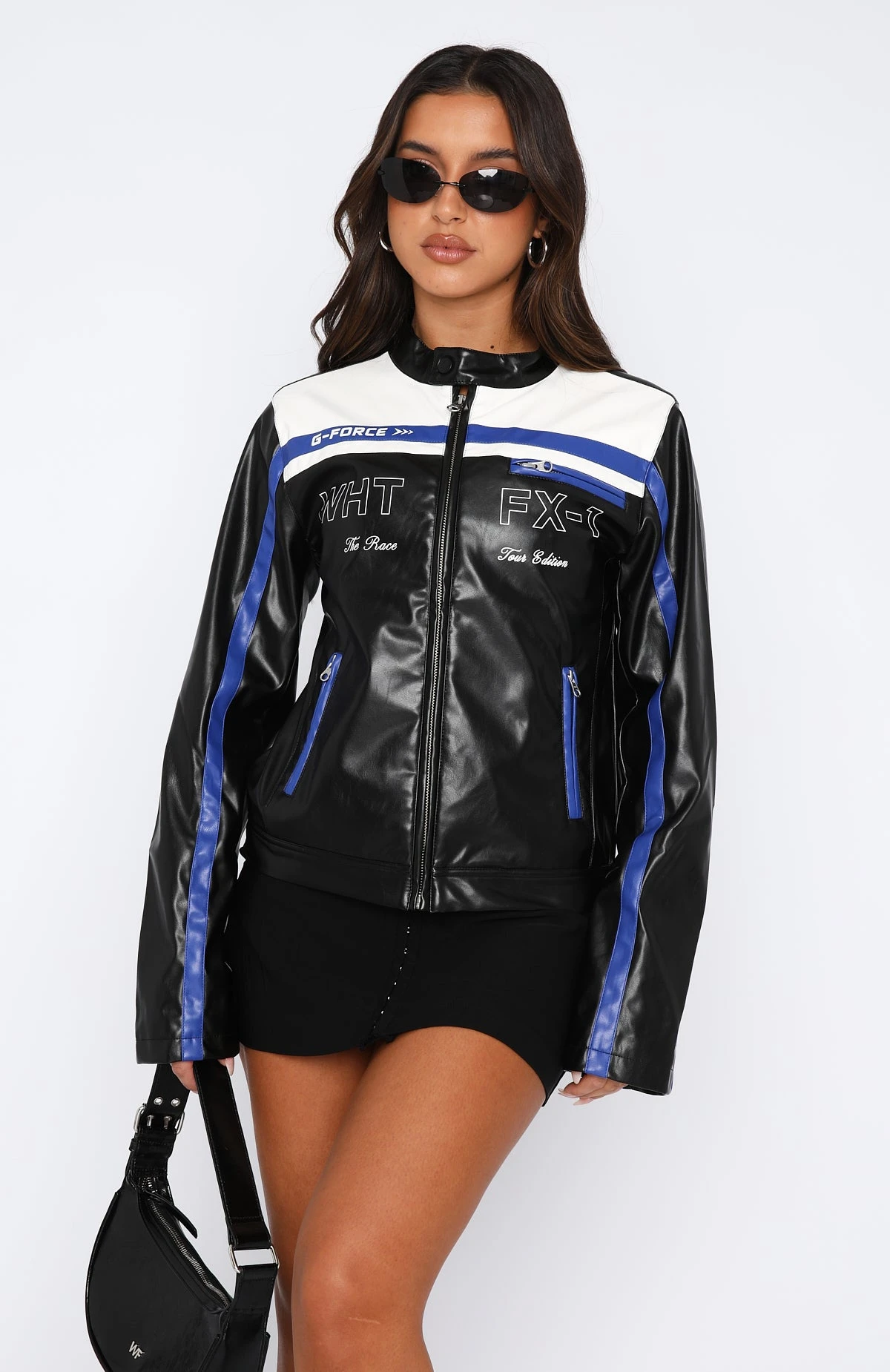 Give your off-duty look some attitude with this On The Open Road PU Biker Jacket Midnight. Featuring long sleeves, front zipper closure with popper on neckline, side pockets and contrast print throughout for a stylish design. We love this paired over any outfit for a fresh new vibe!