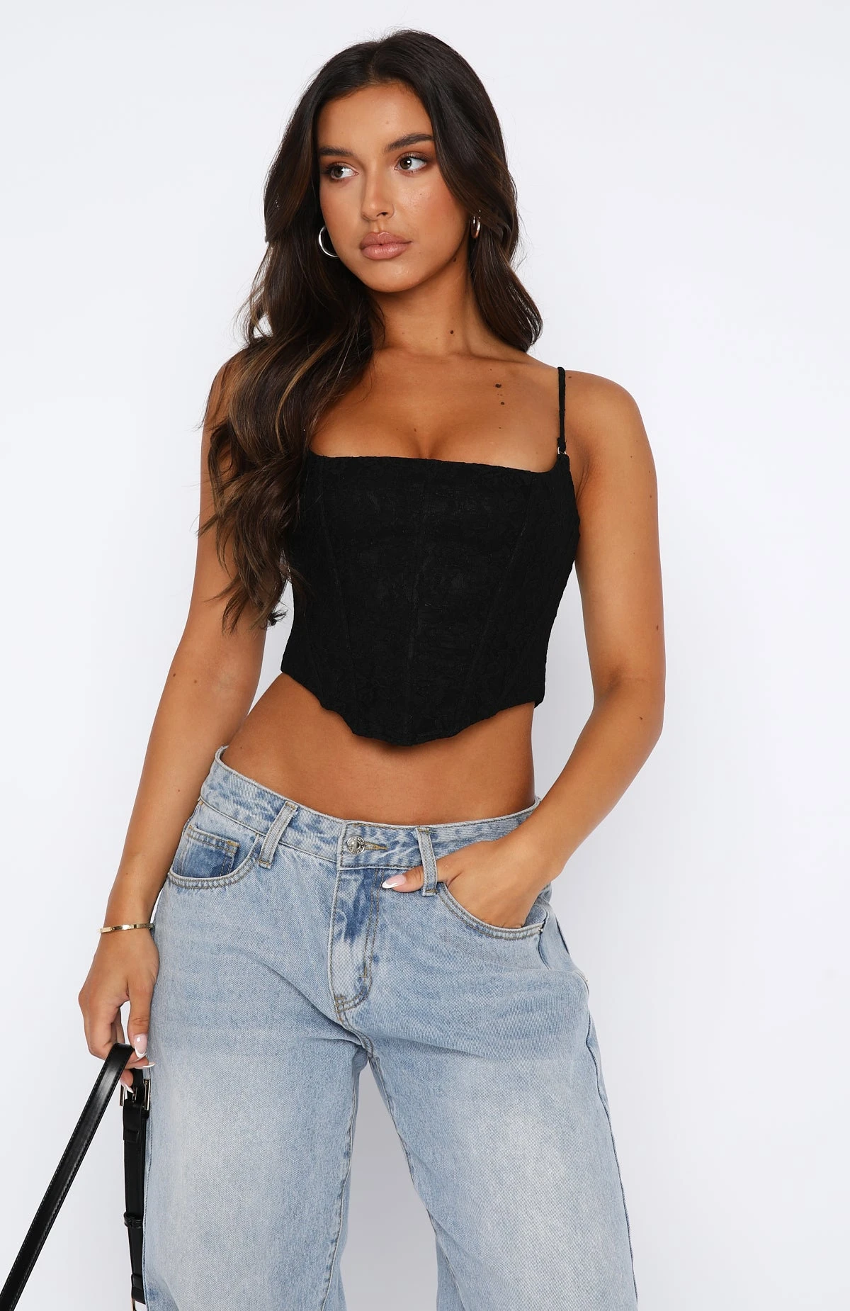 Get ready to earn all the likes with this new season statement piece. The Out Of Luck Bustier Black features thin, adjustable straps, cropped length, boning in bodice, lace detailing and eyelet back fastening. Pair with one of your favourite pair of White Fox Denim Jeans for the perfect girls night out outfit! Don’t miss out on this must-have and trending piece for an insta-worthy look.