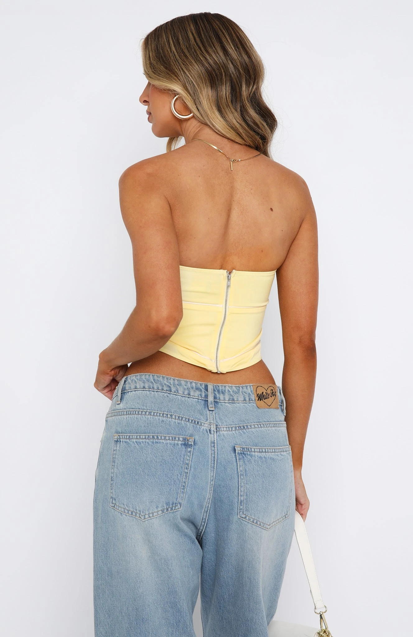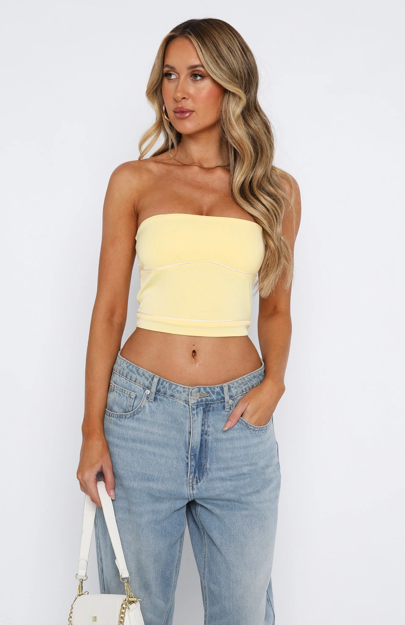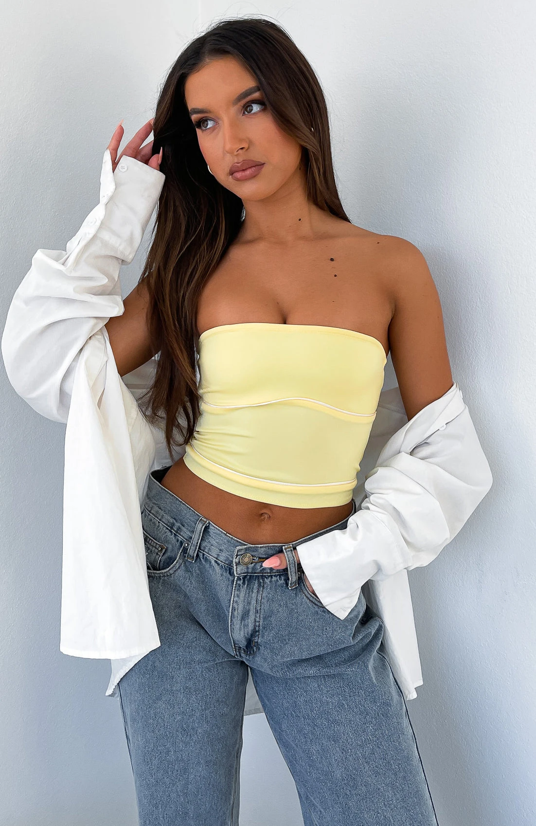 Make weekend styling simple with the Ride With Me Strapless Crop in Lemon with white contrast. Featuring grip tape, zipper centre back, lined at bust and cropped length. We love this paired with clear heels and gold accessories for a look we love!