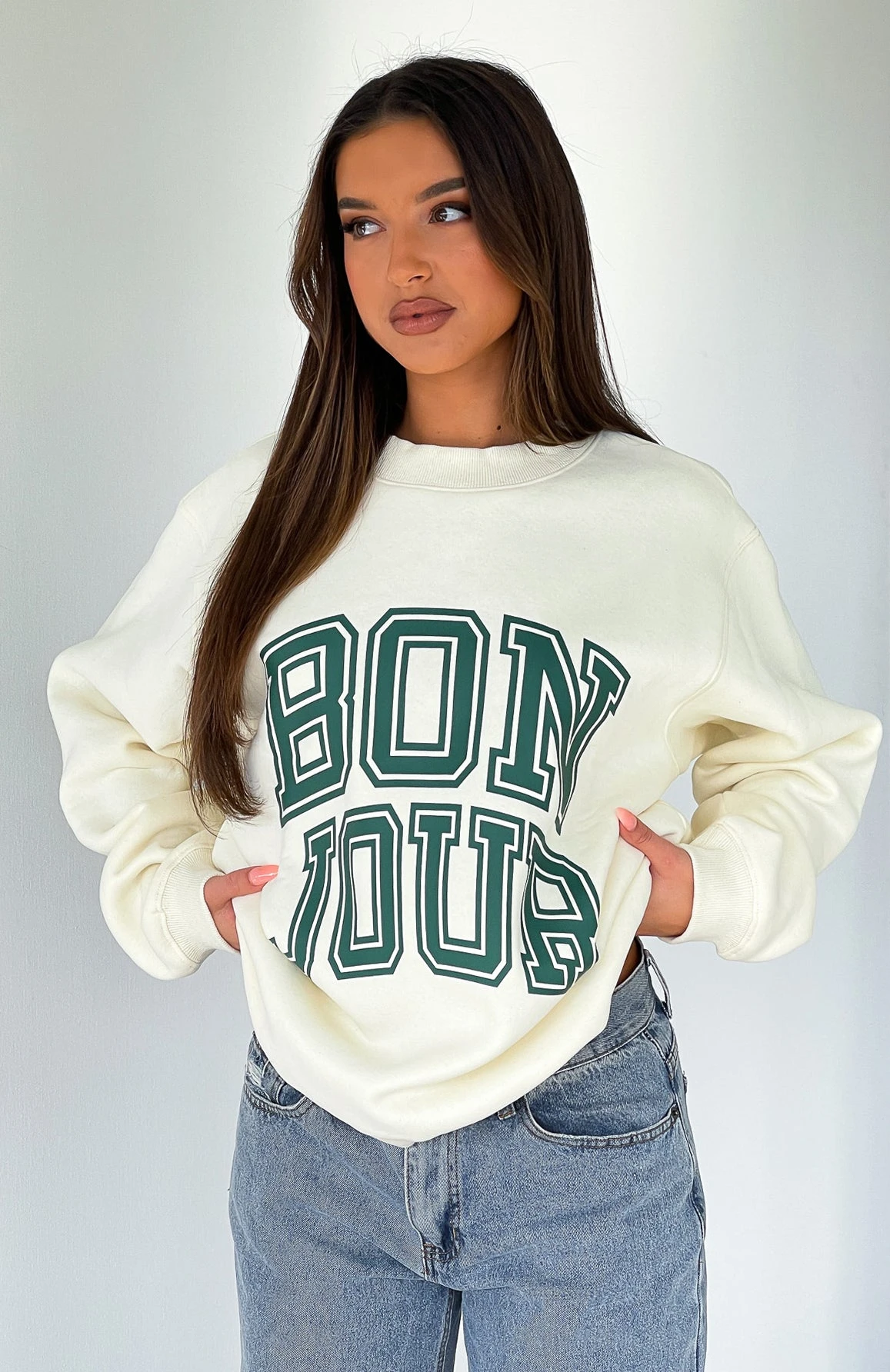 Stay comfy and cosy in the Take Me To Paris Oversized Sweater in Cream. This oversized sweatshirt has a high scooped neckline, ribbed neckline, cuffs and hem, printed logo centre front and super soft fleece lining for extra comfort. We love this paired with bike shorts and sneakers for a look we love!