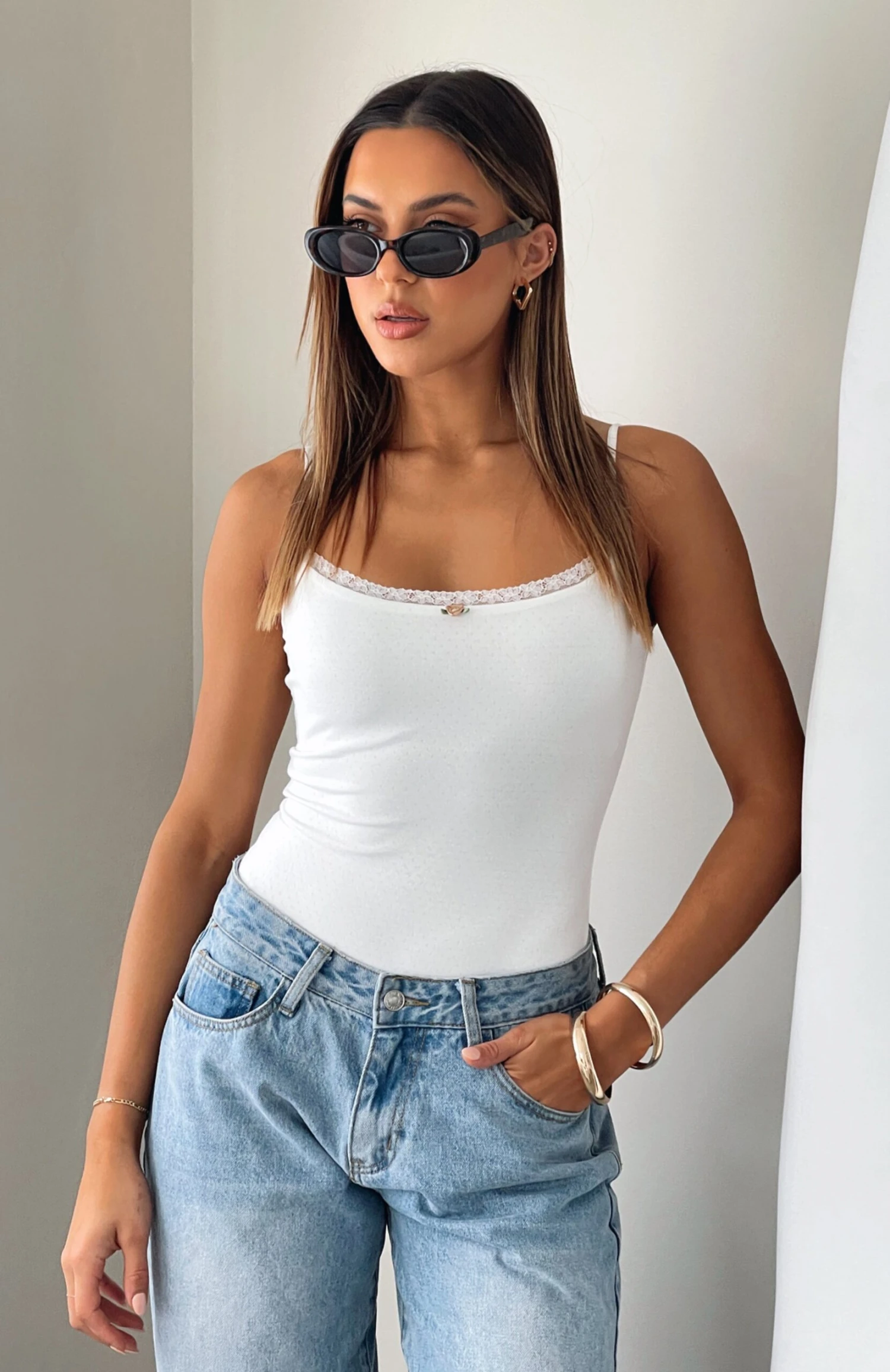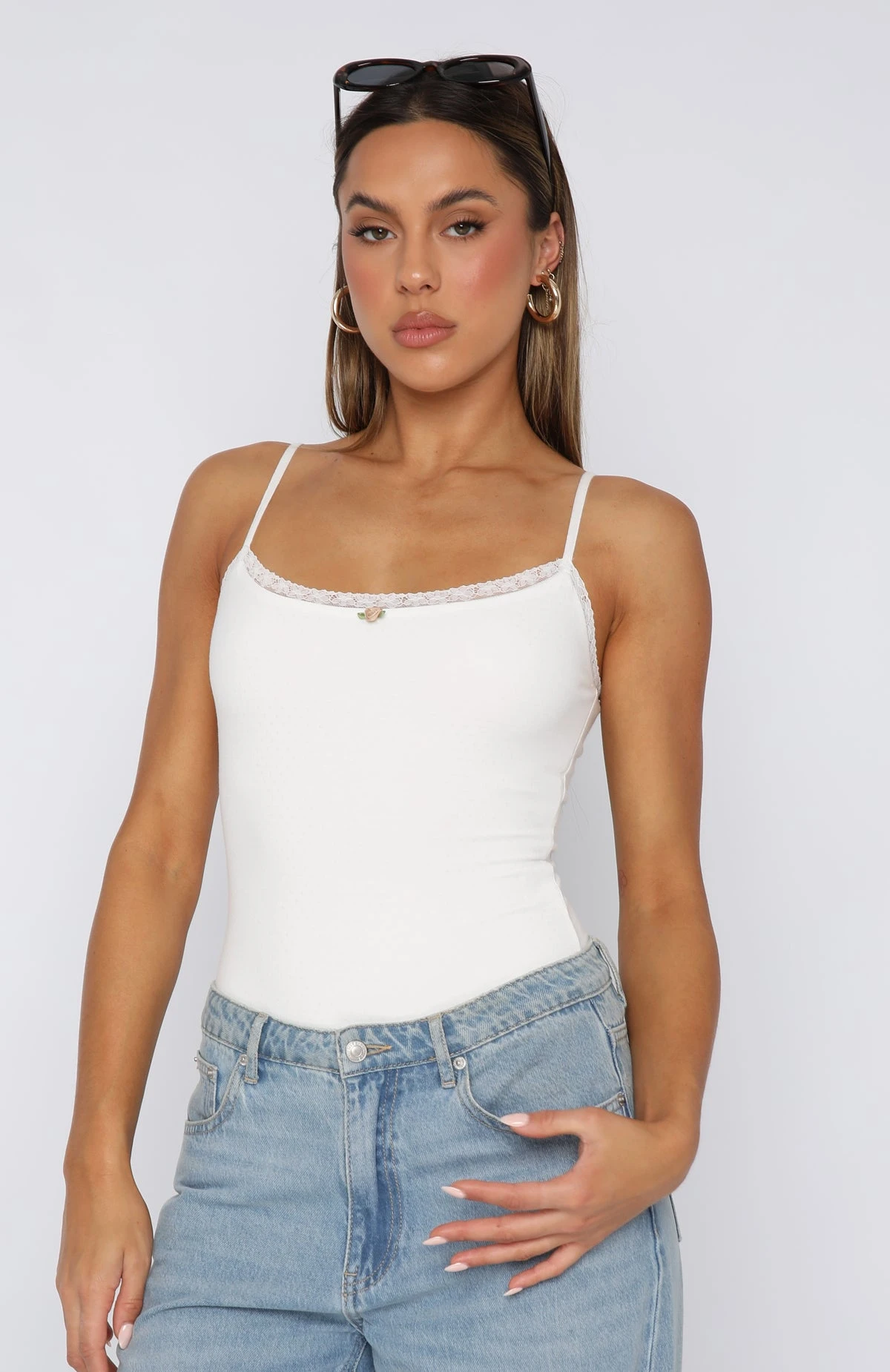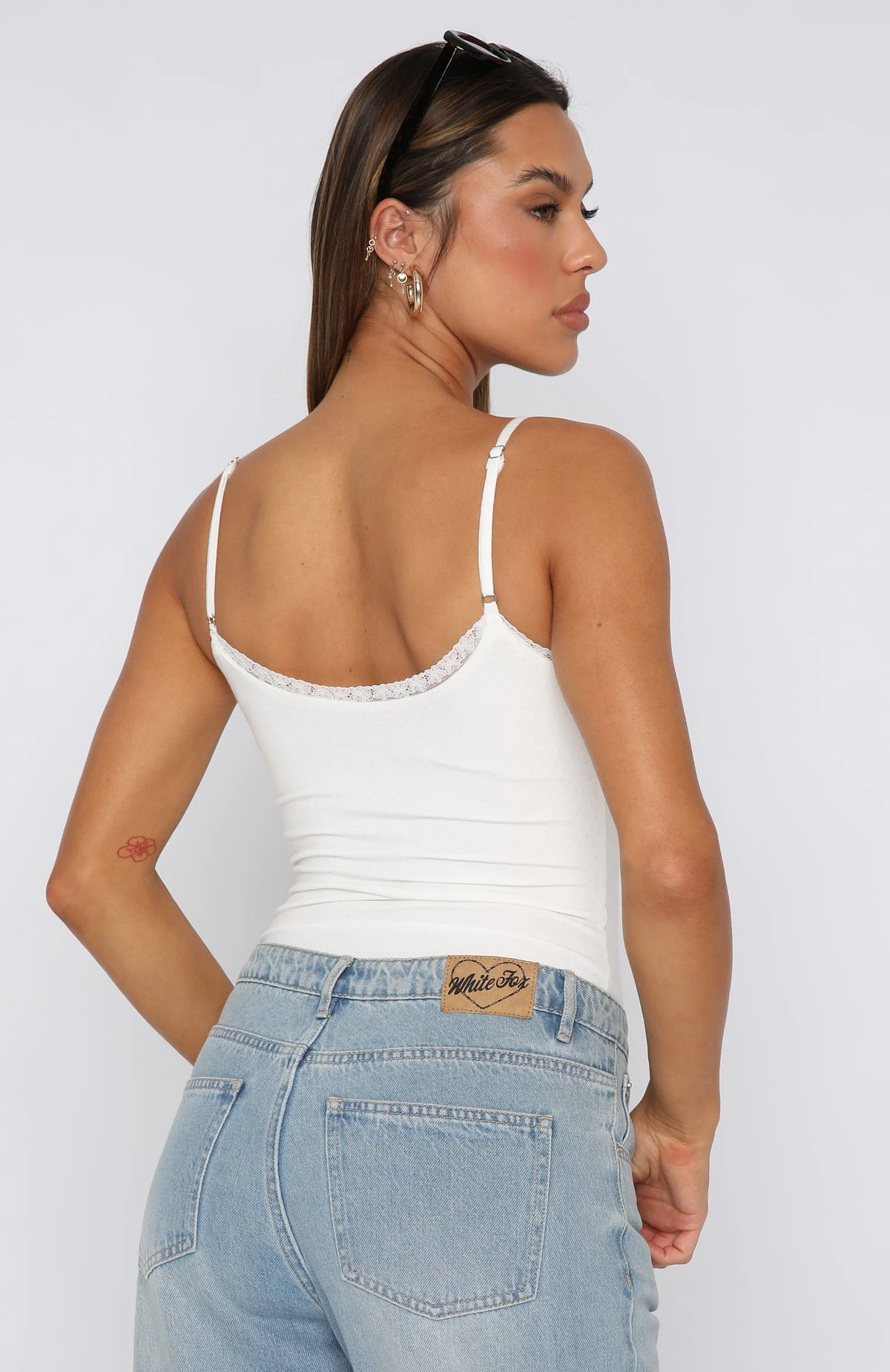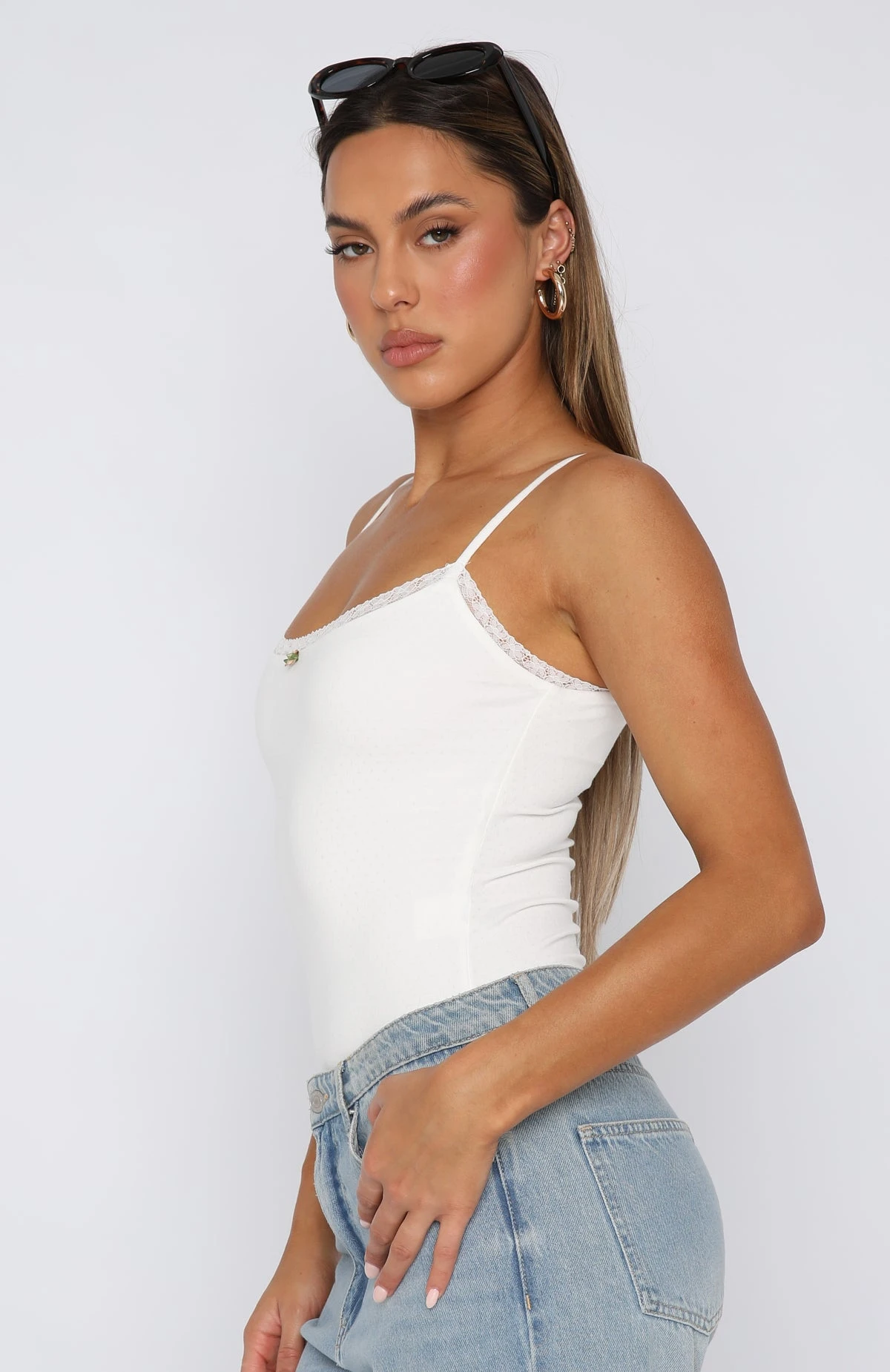 Featuring thin, adjustable straps, popper closure and textured fabric with lace trim detailing. We love this paired with your favourite pair of White Fox Denim Jeans and heels for a look we are obsessed with!