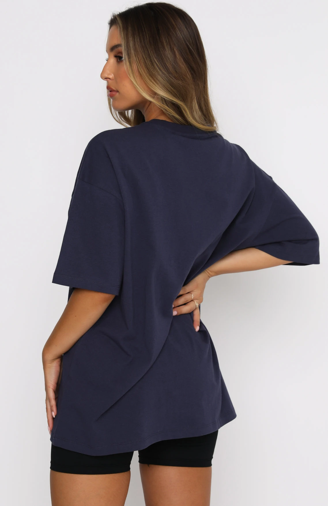 Style meets comfort in our Varsity Tee in Navy. This oversized top has a high scooped neckline, slouch shoulders, and printed graphic centre front. Complete the look with bike shorts and sneakers for a seriously stylish outfit.