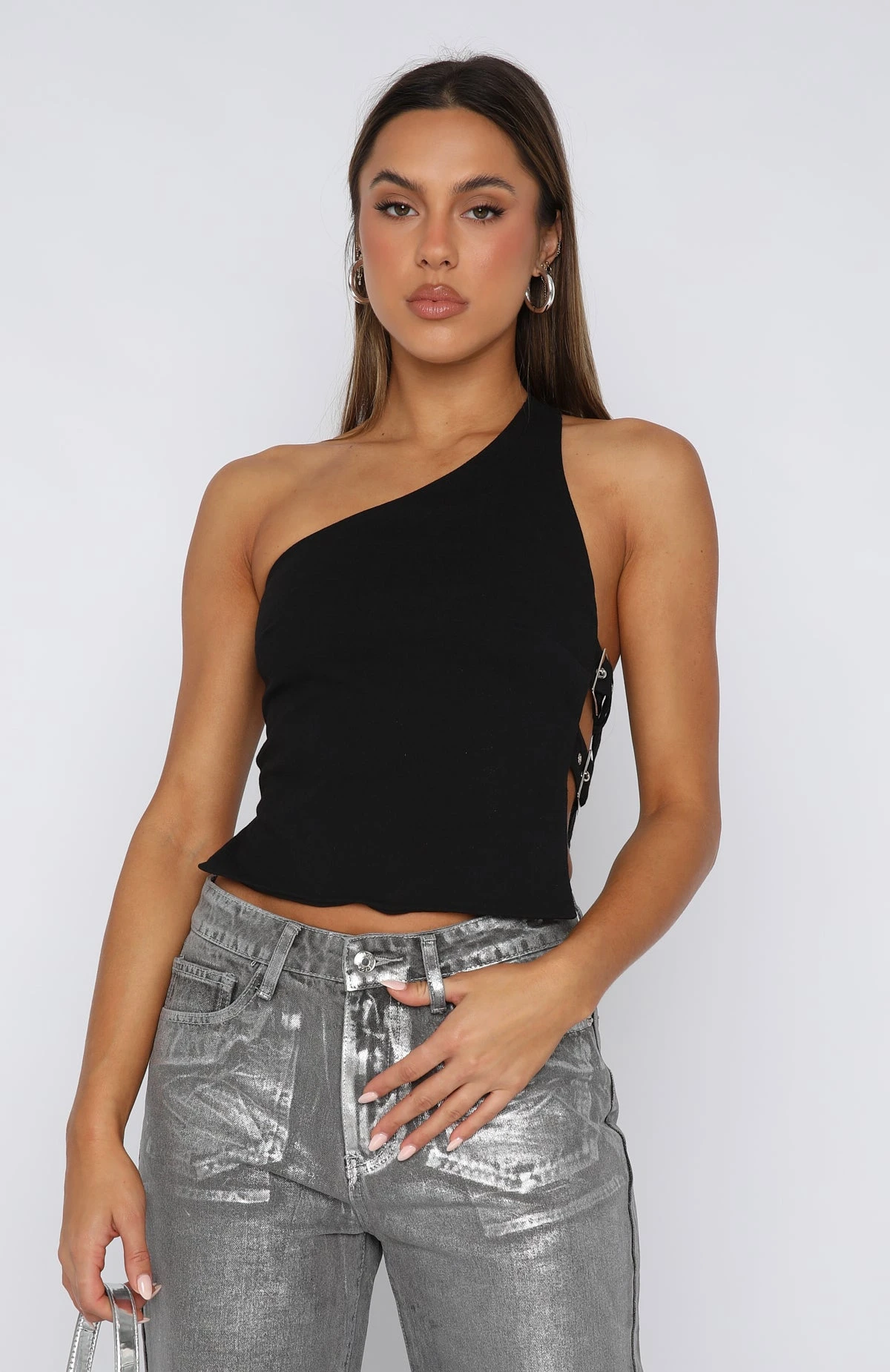 Slay the night in new, Walk To Remember Top Black. Features a one-shoulder fit, backless design with adjustable metal buckle straps, cropped length and lined fabric. Pair with a simple bottom and let the top do all the talking! We’re in love.